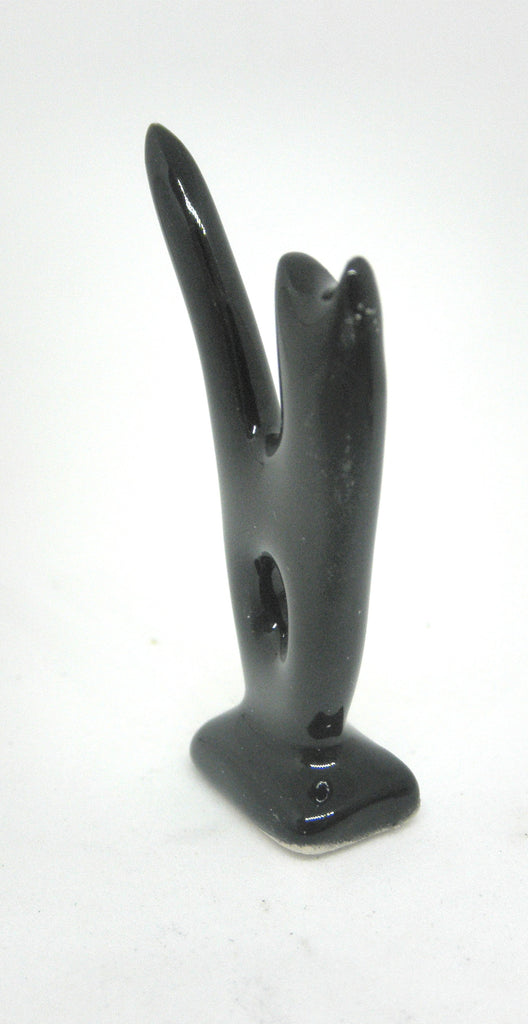 A sleek 1:12 scale ceramic cat sculpture, shaped in an abstract modern form with a high-gloss black glaze. Its fluid silhouette and cut-out detailing give it a sculptural presence that reads as both stylized feline and contemporary art object. A striking miniature accent for shelves, gallery-style displays, or modern dollhouse interiors. It is 1 1/4 inch high by 3/4 inch wide.