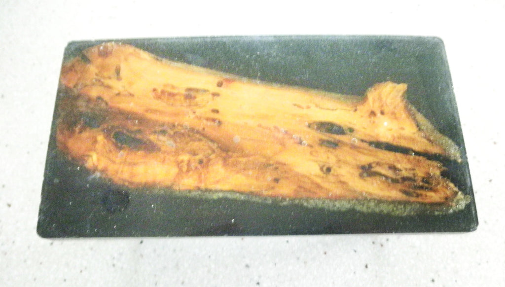 OOAK 1/12th miniature dining room table. Beautiful wood encased in black epoxy resin. The resin highlights the details of the wood grain. The table has wooden legs.