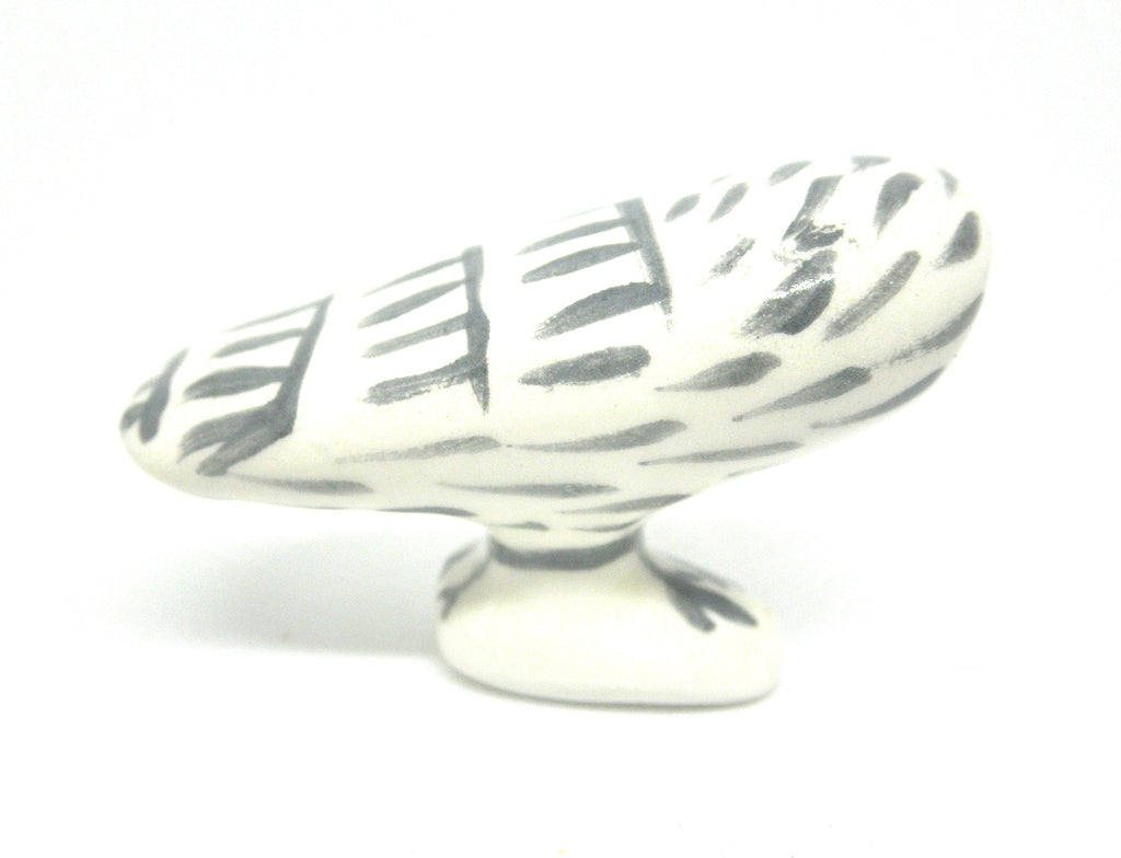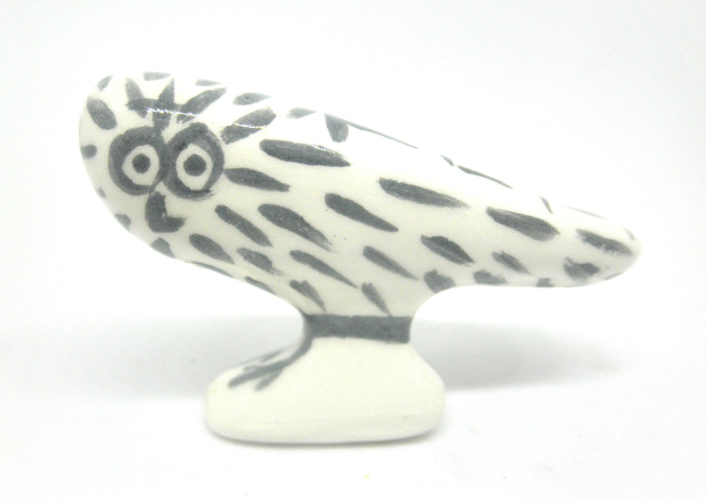 A charming 1:12 scale ceramic owl inspired by the playful, graphic style found in Picasso’s animal studies. Hand-sculpted and hand-painted in crisp black and white, this miniature perches on a small base and features bold linework, simplified shapes, and a lively, expressive presence. A perfect collectible accent for modern, art-forward miniature scenes. 1/4-inch high by 1 3/4 inch long.