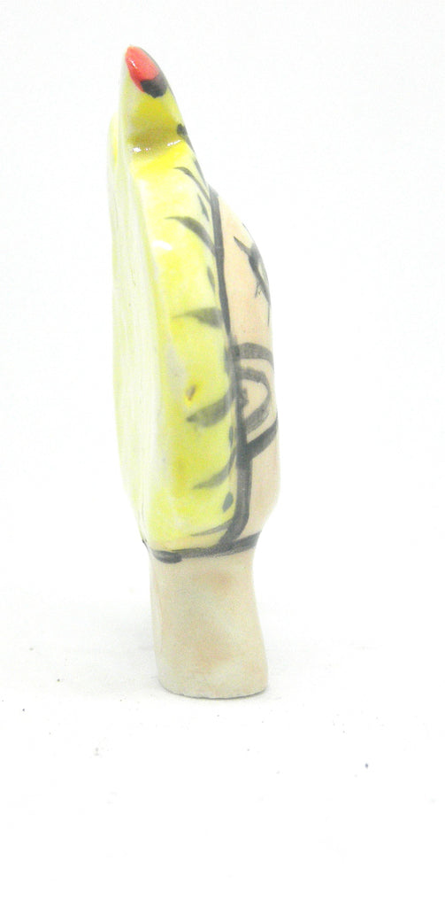 This hand sculpted, hand painted and signed stylized woman sculpture has a bird on her head. It is finished with a high fire transparent glaze and stands 2 inches high and 1 1/4 inch wide.