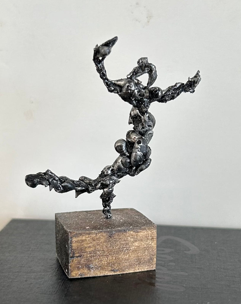 A hand-shaped metal figure poised in a moment of expressive balance. Its textured surface and dynamic pose celebrate movement and the timeless elegance of the human form. Mounted on a wooden base, each piece is unique.