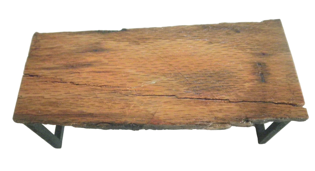 OOAK 1/12th miniature dining room table not quite rectangular. Beautiful wood sealed with varnish. The table has black wooden legs and is 6 1/4 inches by 2 1/2 on one end and 2 3/4 on the other end. It is 2 1/4 inches high.