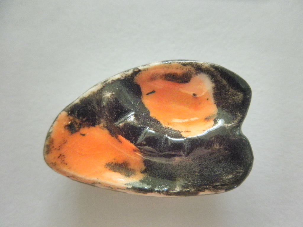 This handmade Mid Century ceramic ashtray has a raised foot and is 1 inch long and 3/4 inch wide.