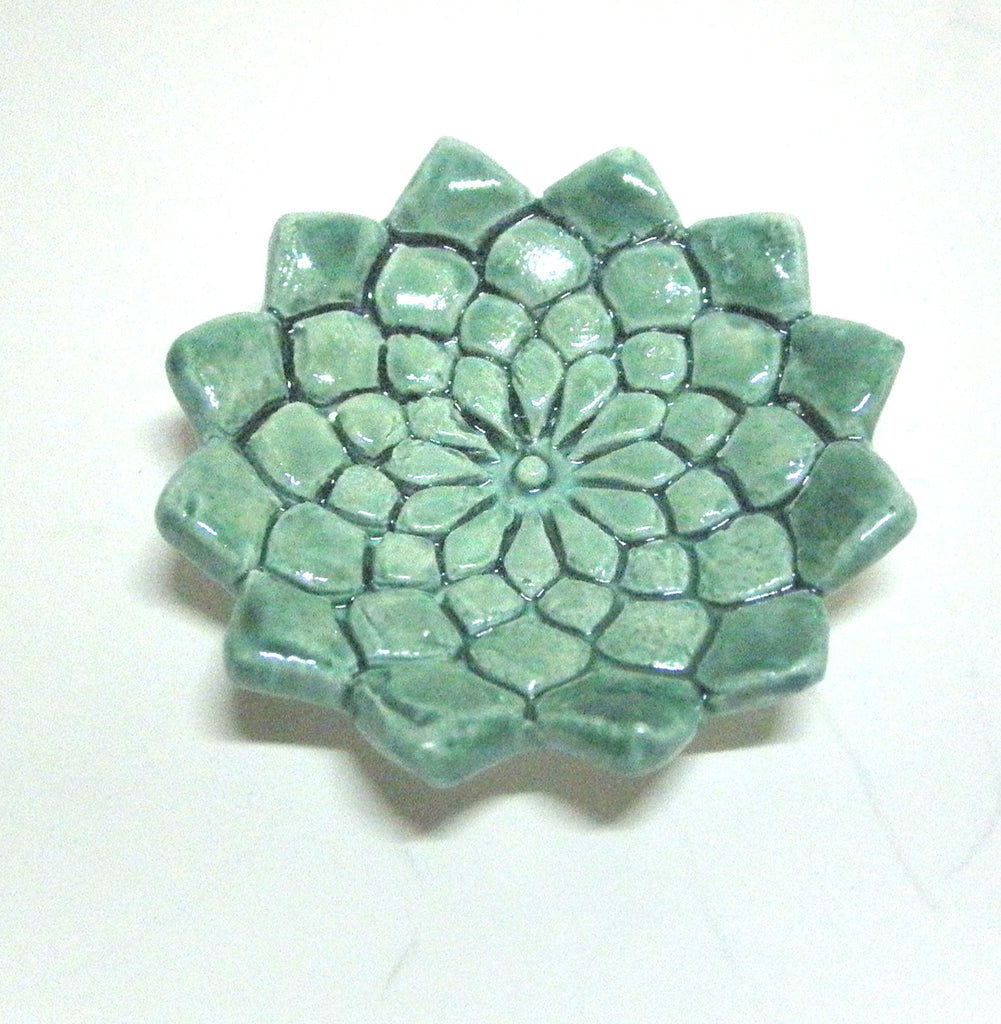 This handmade, and hand glazed ceramic bowl is 1 1/2 inch in diameter and 1/4 inches high. It has a textured inside glazed in light green. Its artistic quality should appeal to art collectors.
