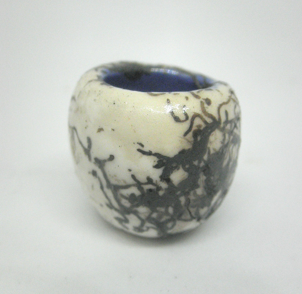 Miniature ceramic small vase with hair decoration. blue inside - B